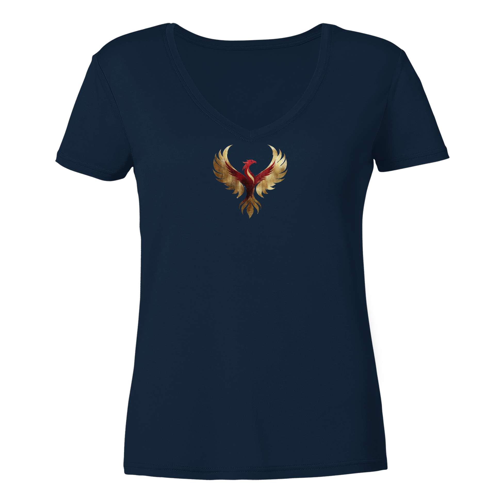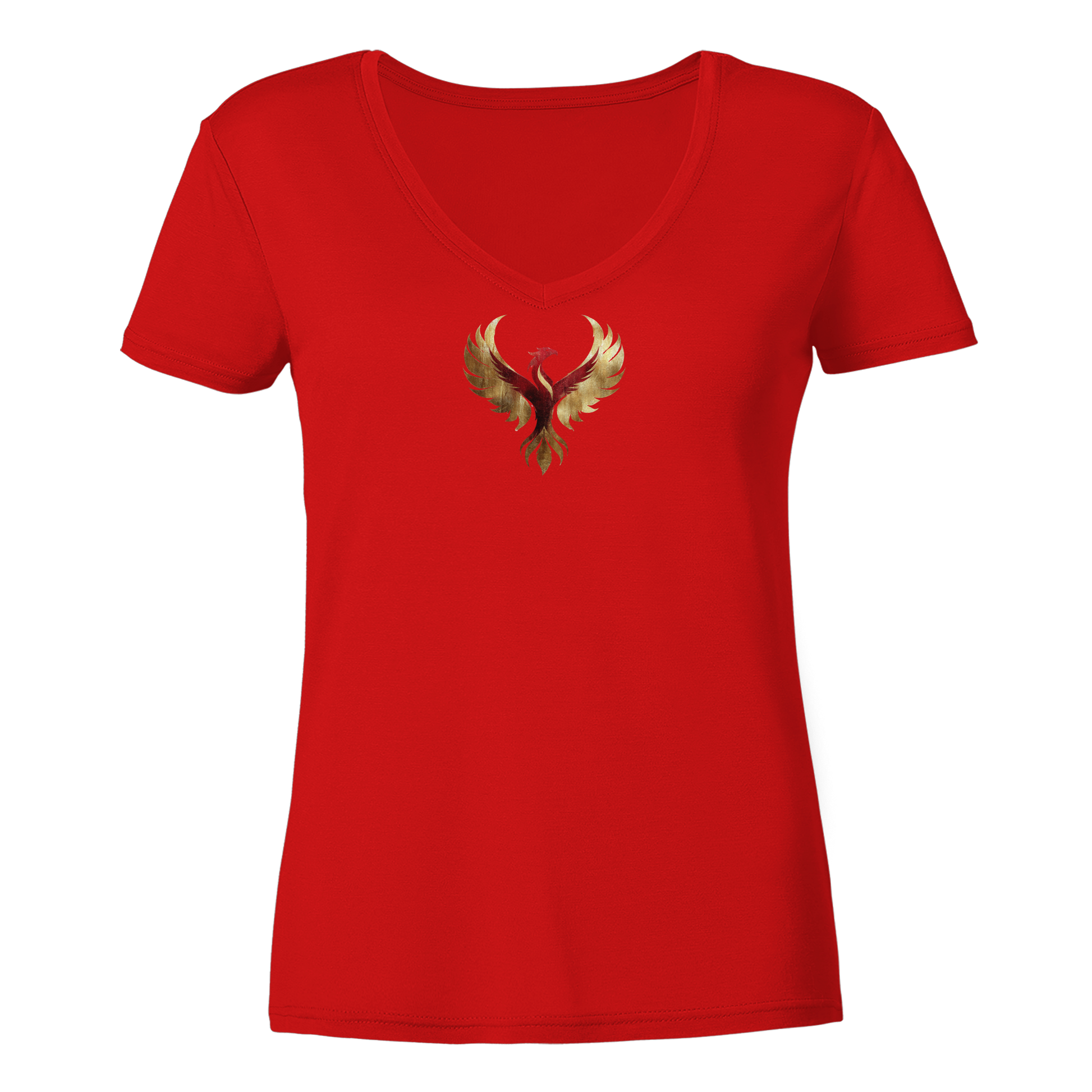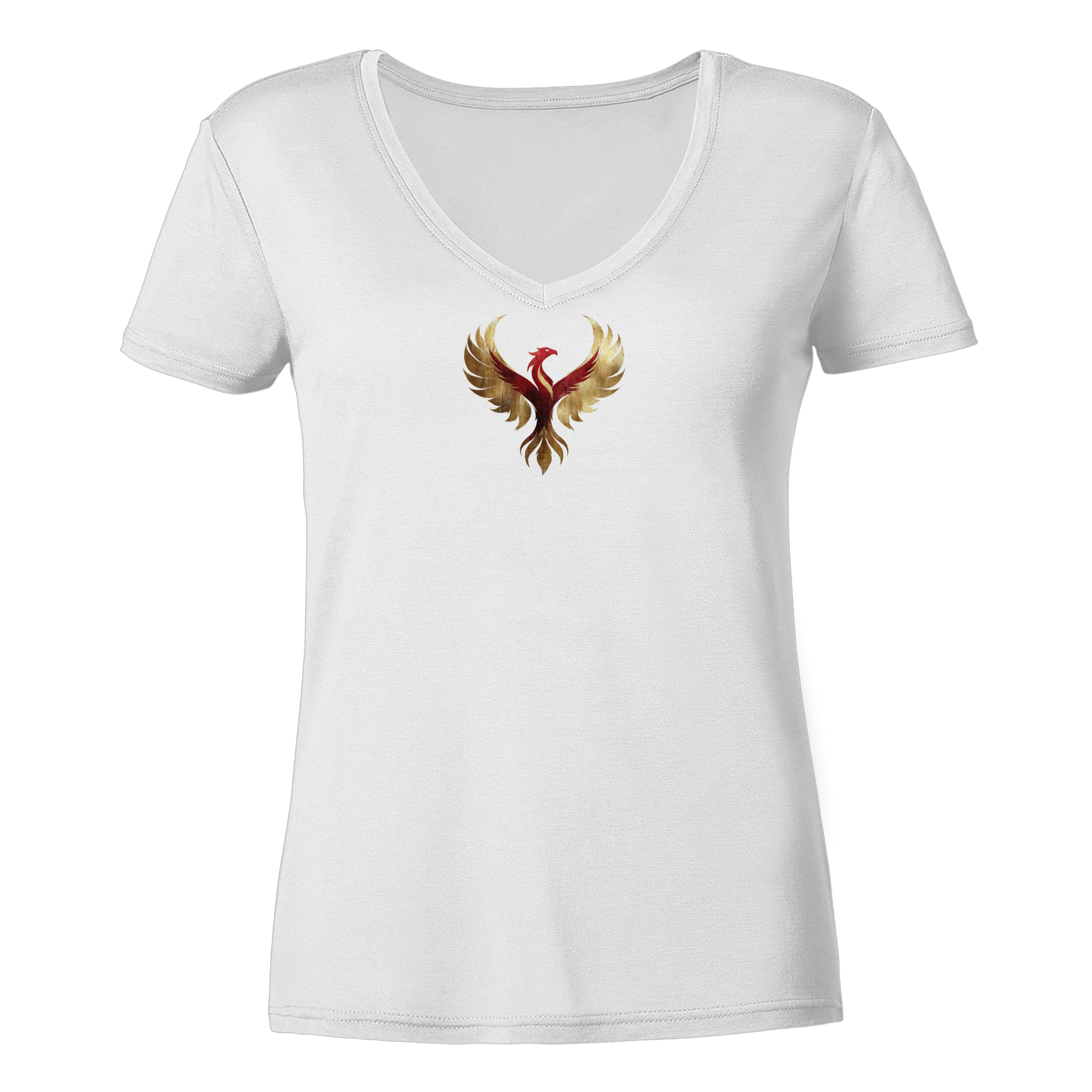 Erleben Sie die Kraft der Erneuerung mit unserem 'Phönix - Damen V-Ausschnitt Shirt'. Die majestätische Phönix-Grafik in leuchtenden Rot- und Goldtönen steht für Transformation und Stärke, und wird Sie inspirieren, in Ihrem Licht zu erstrahlen.